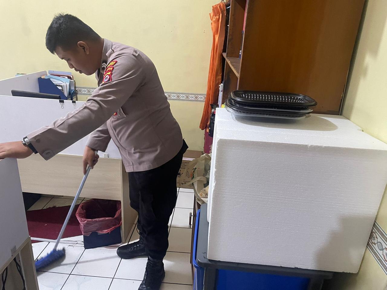 anggota SDM Polres Cilegon, Melaksanakan menjaga kebersian aktif di ruangan kerjja setiap saat.
