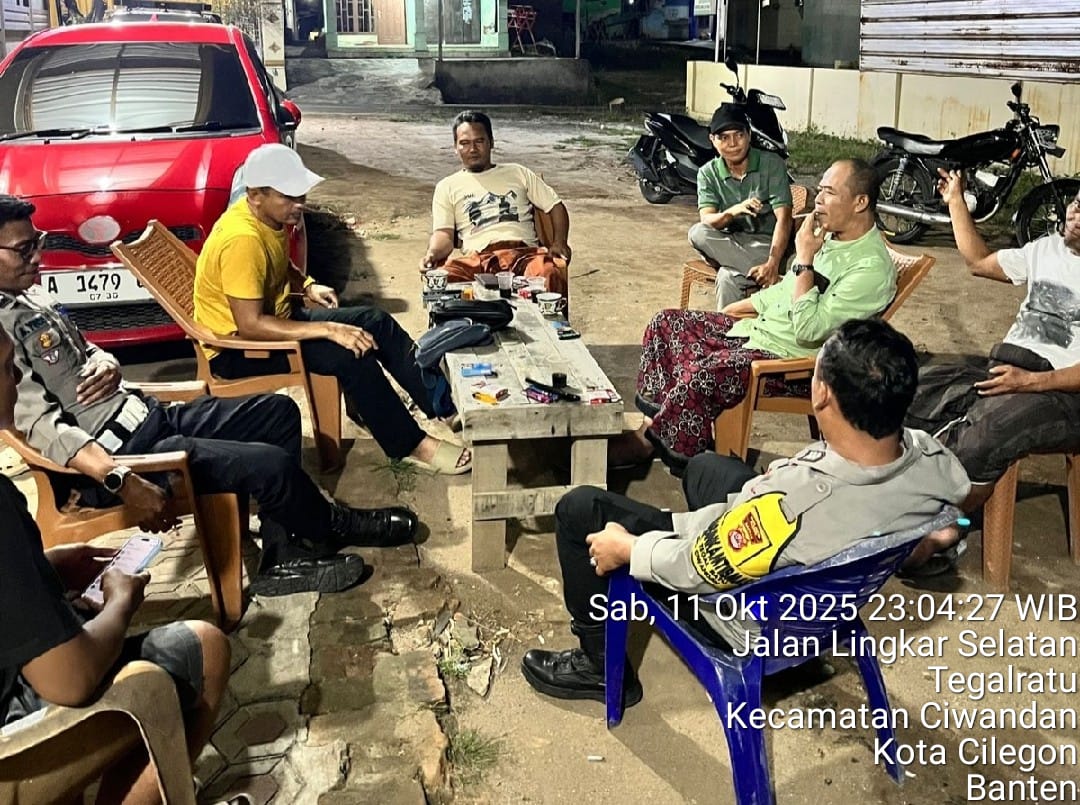 Cilegon - Bhabinkamtibmas Polsek Ciwandan Polres Cilegon Polda Banten Melaksanakan Patroli Kunjungan Malam dan terus memberikan pembinaan dan penyuluhan tentang pentingnya menjaga kamtibmas di daerah hukum Polsek Ciwandan Polres Cilegon Polda Banten, Minggu (12/10/2025).