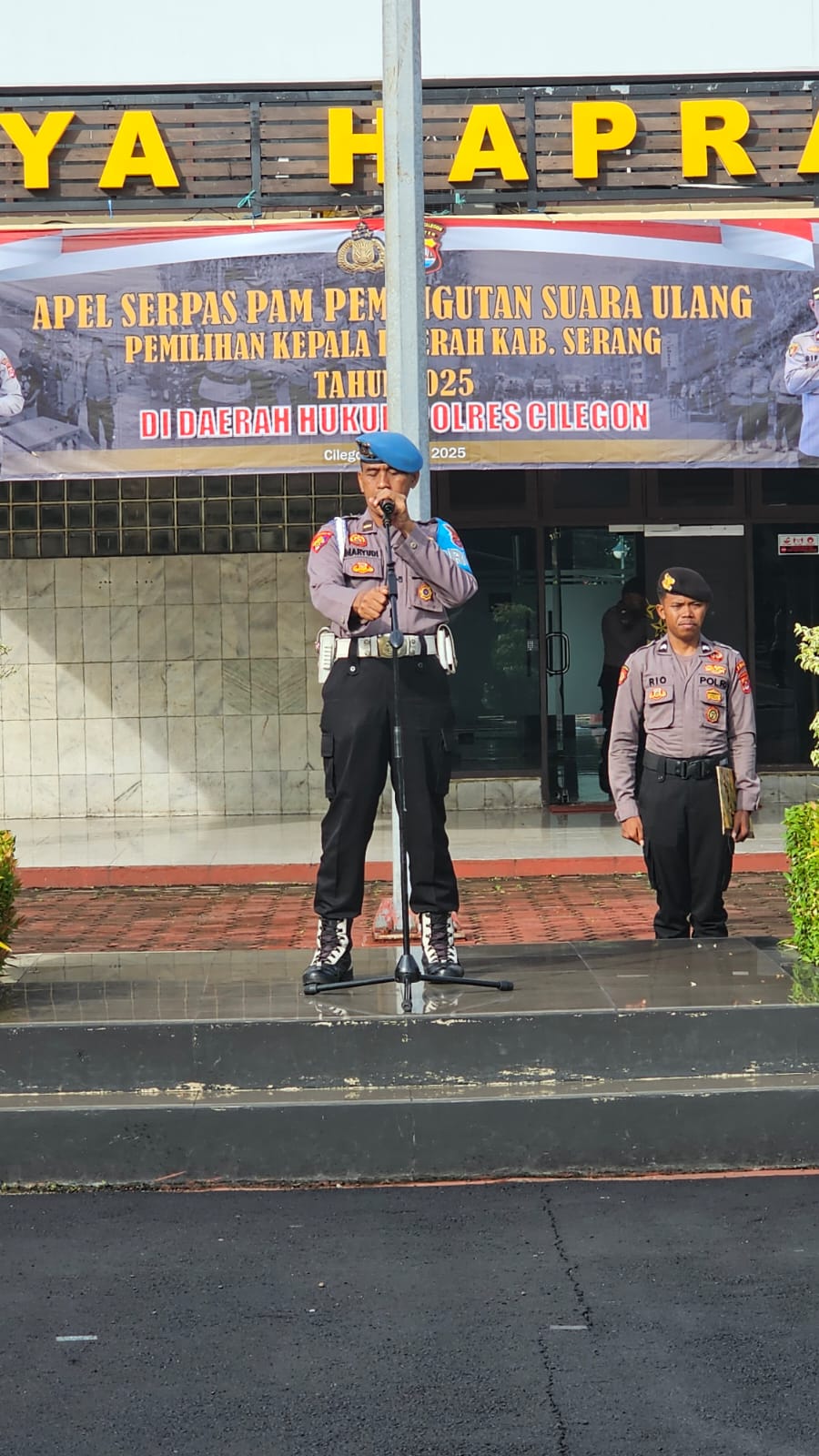 Personil Sipropam Polres Ciegon melakukan Pengecekan absensi kehadiran pada saat pelaksanaan apel fungsi,Senin 03/11/2025) bertempat di Lapangan  Apel Polres Cilegon.