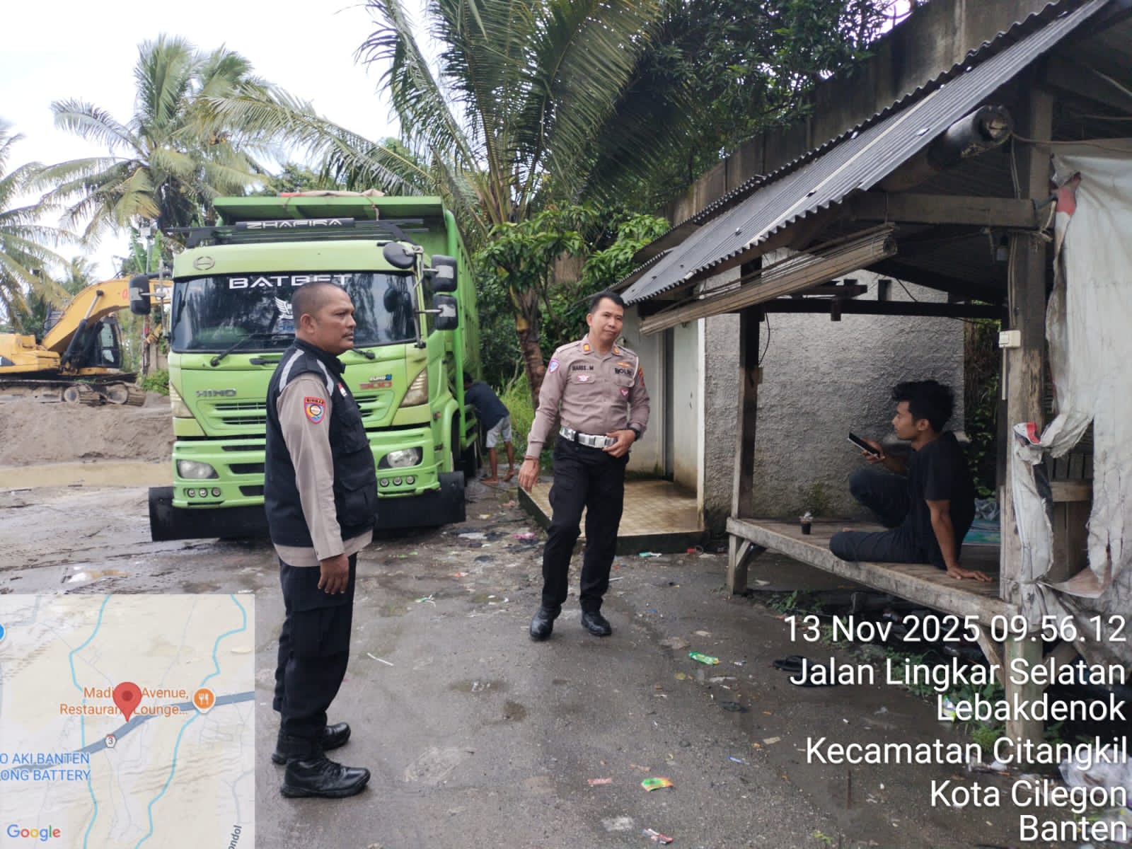 Cilegon - Kanit Lantas Polsek Ciwandan AKP Haris Munandar Bersama Bhabinkamtibmas Kelurahan Lebak Denok AIPTU Yudi Setiawan melaksanakan Himbauan SK Gubernur Dan monitoring stokfile pasir Didaerah hukum Polsek Ciwandan, Kamis (13/11/2025).