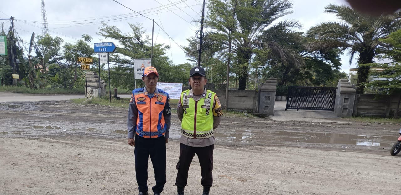 Strong Poin Sore, Bhabinkamtibmas dan Dishub Laksanakan Pengaturan lalu lintas Di Jalan Raya PT MSJ Bojonegara