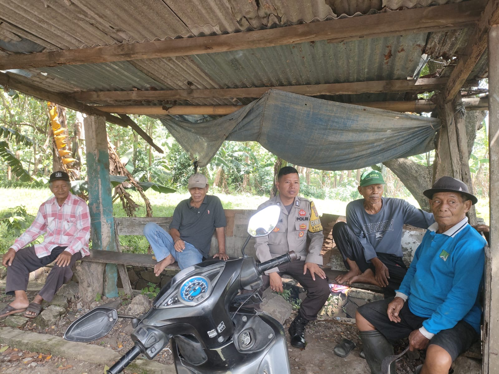 Bhabinkamtibmas Bripka Agustoni menyambangi pangkalan ojek di Jalan Madani No.1, Komplek Perumahan KS, Kelurahan Kotabumi, Kecamatan Purwakarta, Kota Cilegon