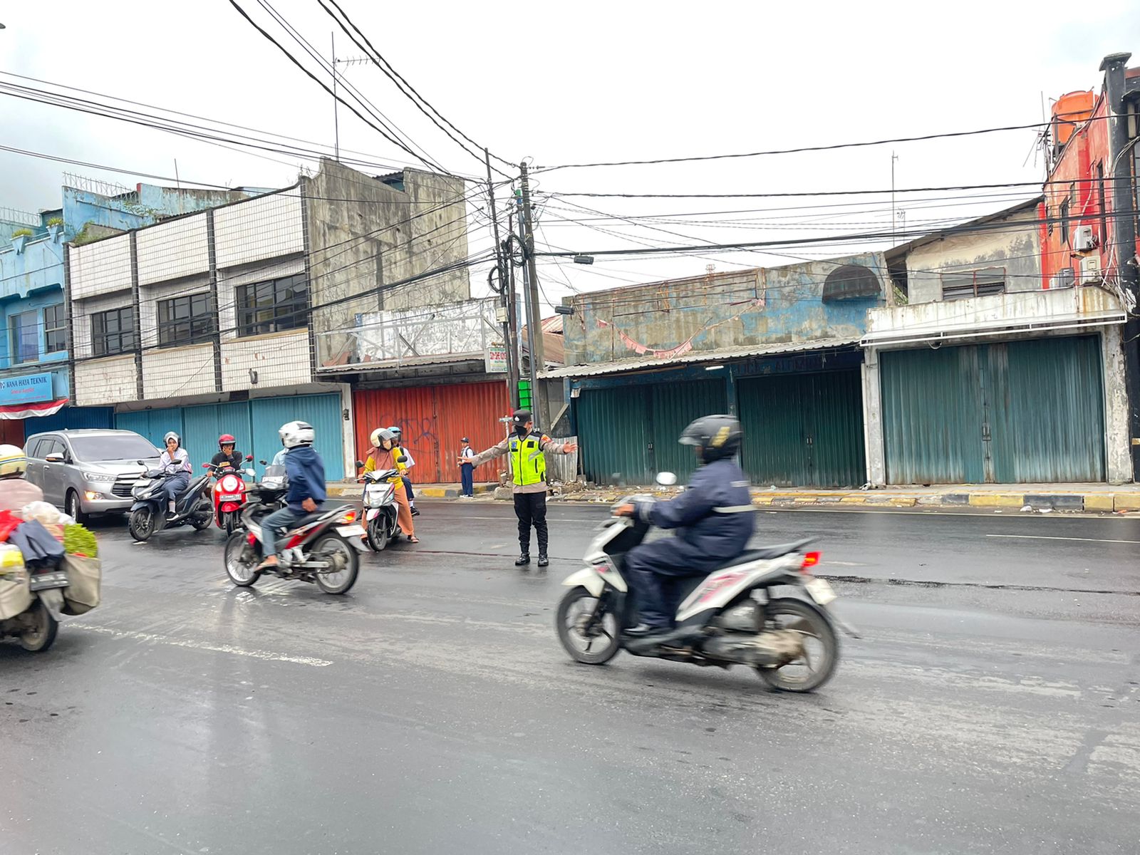 Cilegon,Polres Cilegon Polda Banten Pada Hari Senin/24/11/2025 Pukul 06.30 Wib, Personil Siwas Polres Cilegon, Brigadir Hadi Sudrajat melaksanakan kegiatan pengaturan arus lalu lintas di Jalur Protokol jalan utama Kota Cilegon.