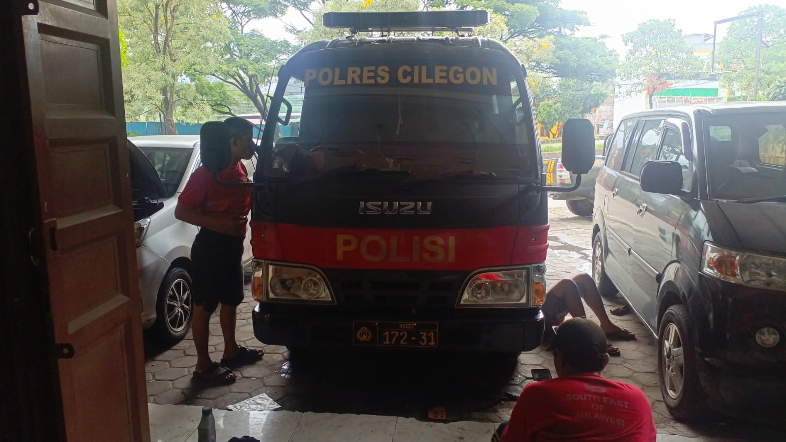 Cilegon Polres cilegon Polda Banten Staf Logistik melakukan pengecekan perawatan kendaraan dinas roda 4 yang sedang di lakukan perawatan.