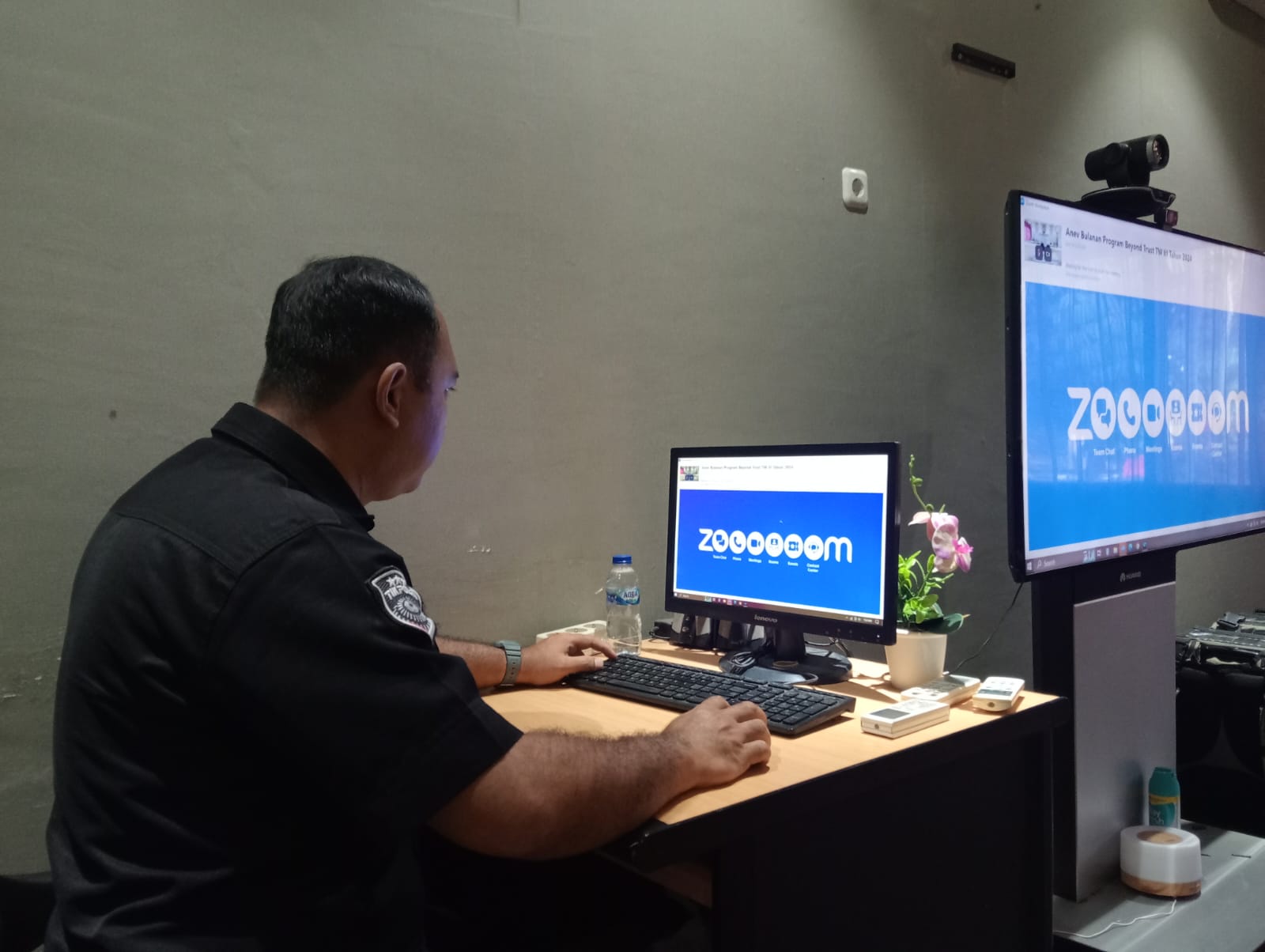 Anggota Tik Polres Cilegon Menyiapkan Sarana dan Prasarana Untuk Kegiatan Zoom meeting Dalam pelaksanaan kegiatan zoom meeting tersebut anggota TIK Polres Cilegon yang bertanggung jawab untuk menyiapkan peralatan zoom. Selain itu agar di tidak ada gangguan jaringan sebelum pelaksanaan anggota TIK melakukan pemeriksaan terhadap sarana dan prasarana tersebut . Satu jam sebelum kegiatan zoom meeting itu dimulai. Kapolres Cilegon AKBP. DR. MARTUA RAJA TARIPAR LAUT SILITONGA. melalui Kasi TIK IPTU Lukman menyampaikan bahwa “untuk menunjang kelancaran penyampaian informasi anggota TIk Polres Cilegon selalu memeriksa sarana dan prasarana tersebut, sebelum maupun pada saat pelaksanaan akan selalu di monitor”
