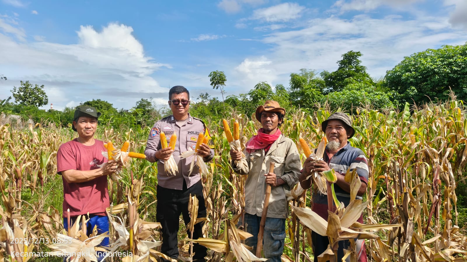 Cilegon - Polsek Ciwandan Polres Cilegon Polda Banten mendukung kegiatan panen jagung Hibrida hasil penanaman Kelompok Tani Kosambi di Kelurahan Samangraya Kecamatan Citqngkil, Kota Cilegon, Sabtu (13/12/2025).