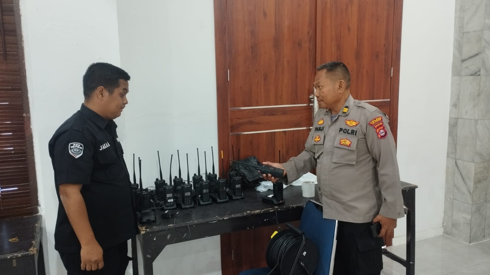 Anggota Tik Polres Cilegon Menyiapkan Sarana dan Prasarana Alkom Dalam pelaksanaan tugas tersebut anggota TIK Polres Cilegon yang bertanggung jawab untuk menyiapkan peralatan sarana alkom berupa handy talky. Selain itu agar di tidak ada gangguan pada jaringan, sebelum pelaksanaan anggota TIK melakukan pemeriksaan terhadap sarana dan prasarana tersebut . Satu jam sebelum sarana alkom digunakan. Kapolres Cilegon AKBP. DR. MARTUA RAJA TARIPAR LAUT SILITONGA. melalui Kasi TIK AIPTU Suwanto, S.H. menyampaikan bahwa “untuk menunjang kelancaran penyampaian informasi anggota TIk Polres Cilegon selalu memeriksa sarana dan prasarana tersebut, sebelum maupun pada saat pelaksanaan akan selalu di monitor”