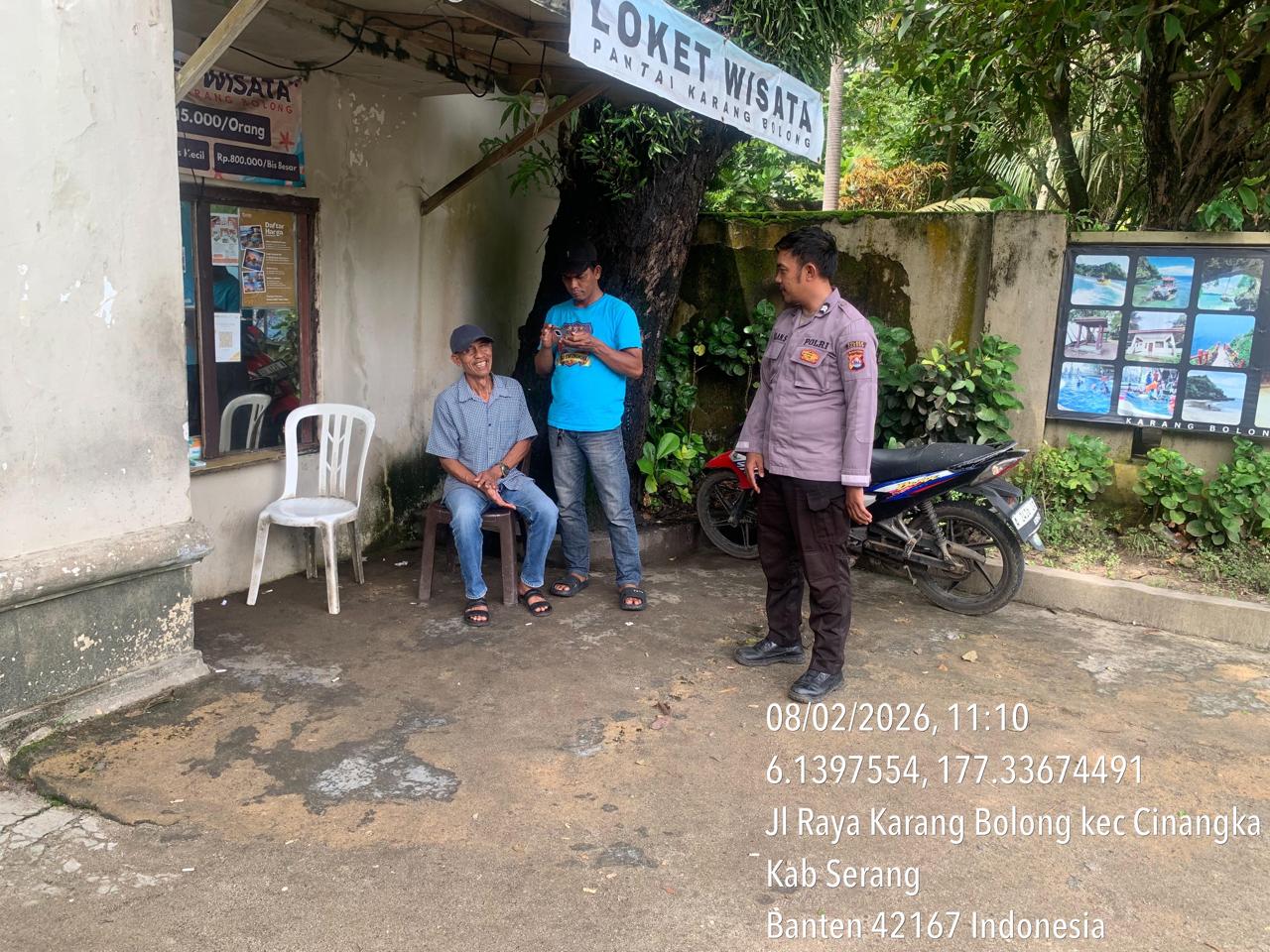 _*POLRES CILEGON*_ | Polsek Cinangka Polres Cilegon Polda Banten melaksanakan kegiatan patroli Serta memberikan Himbauan kepada pengunjung pantai yang berwisata dan Sambang kepada petugas penjaga pantai dan juga antisipasi harkamtibmas di Wilayah Hukum Polsek Cinangka Polres Cilegon Polda Banten, Minggu (08/02/2026).