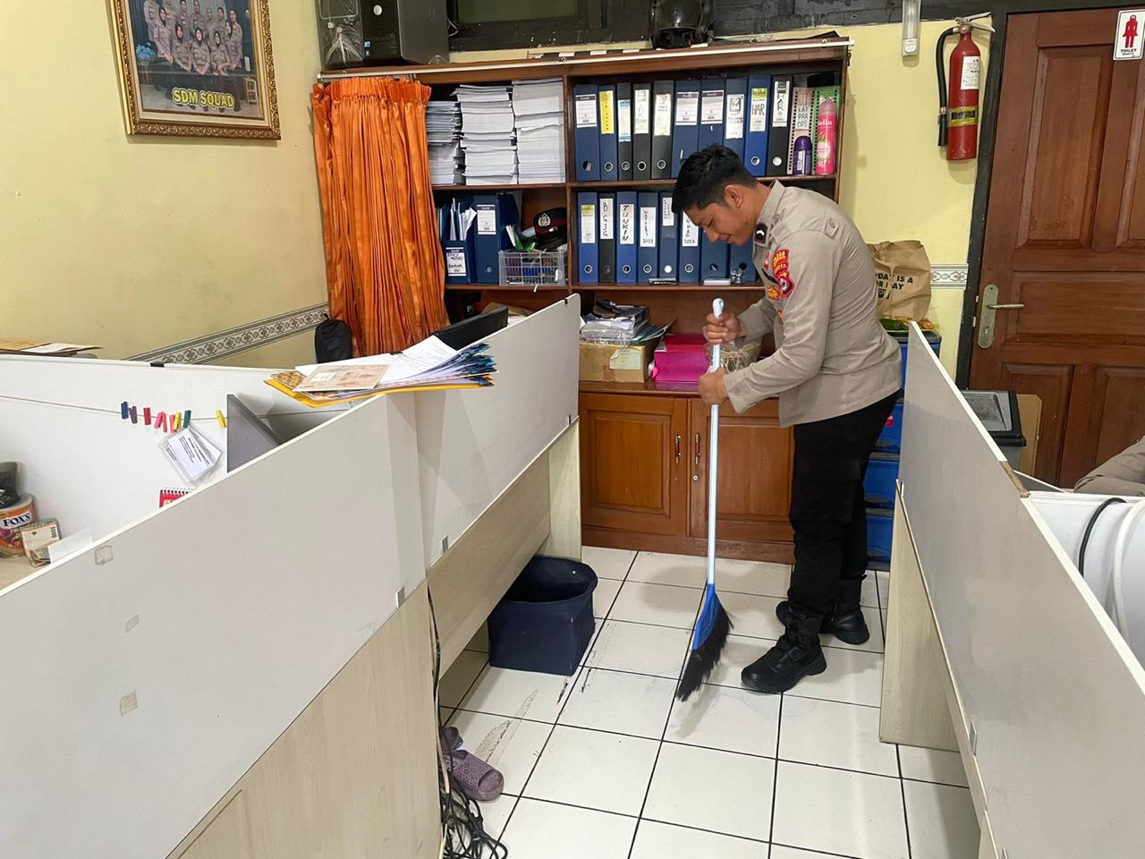 Anggota Bag SDM Polres Cilegon, melakssankan kegiatan membersihkan ruangan kerja secara rutin.