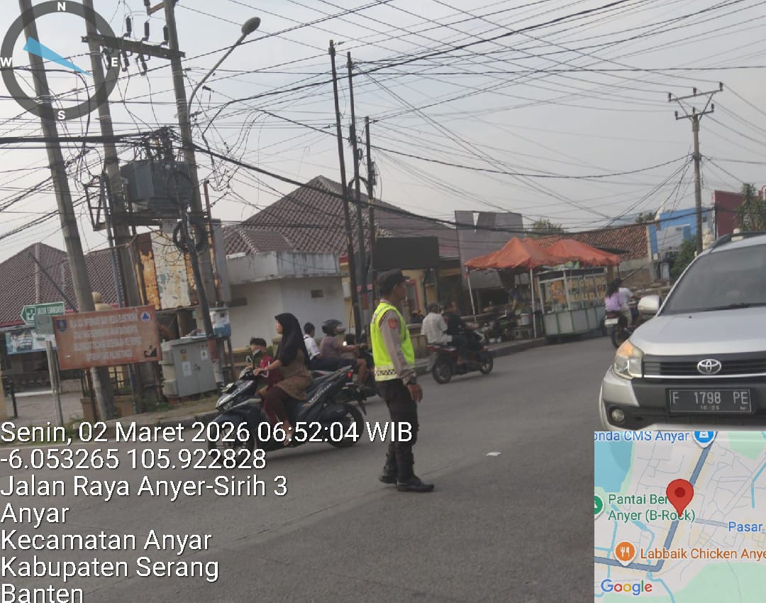 Cilegon – Polres Cilegon Polda Banten, Dalam Mewujudkan Aksi Nyata Pelayanan Kepada Masyarakat, Personil Polsek Anyer Polres Cilegon Laksanakan Strong Point Pengaturan Lalu lintas, Senin (02/03/2026).