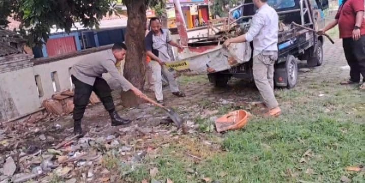 Dalam kegiatan tersebut, Bripka Agustoni bersama warga bergotong royong membersihkan sampah dan material yang berserakan di sekitar lingkungan serta mengangkutnya menggunakan kendaraan untuk dibuang ke tempat yang telah disediakan.