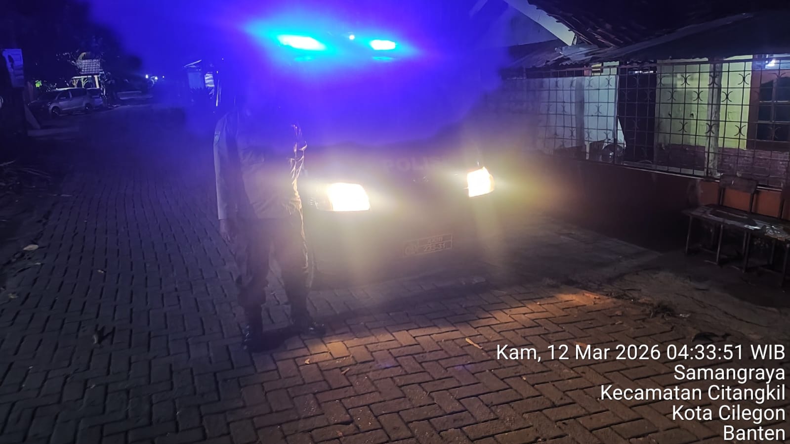 Cilegon - Personil Polsek Ciwandan Polres Cilegon Polda Banten Dalam Pelaksanaan Kegiatan Patroli dengan menyalakan lampu rotator berwarna biru di Daerah Hukum Polsek Ciwandan Polres Cilegon Polda Banten dari malam hingga dini hari, dalam rangka menciptakan situasi aman dan kondusif, Kamis (12/03/2026).