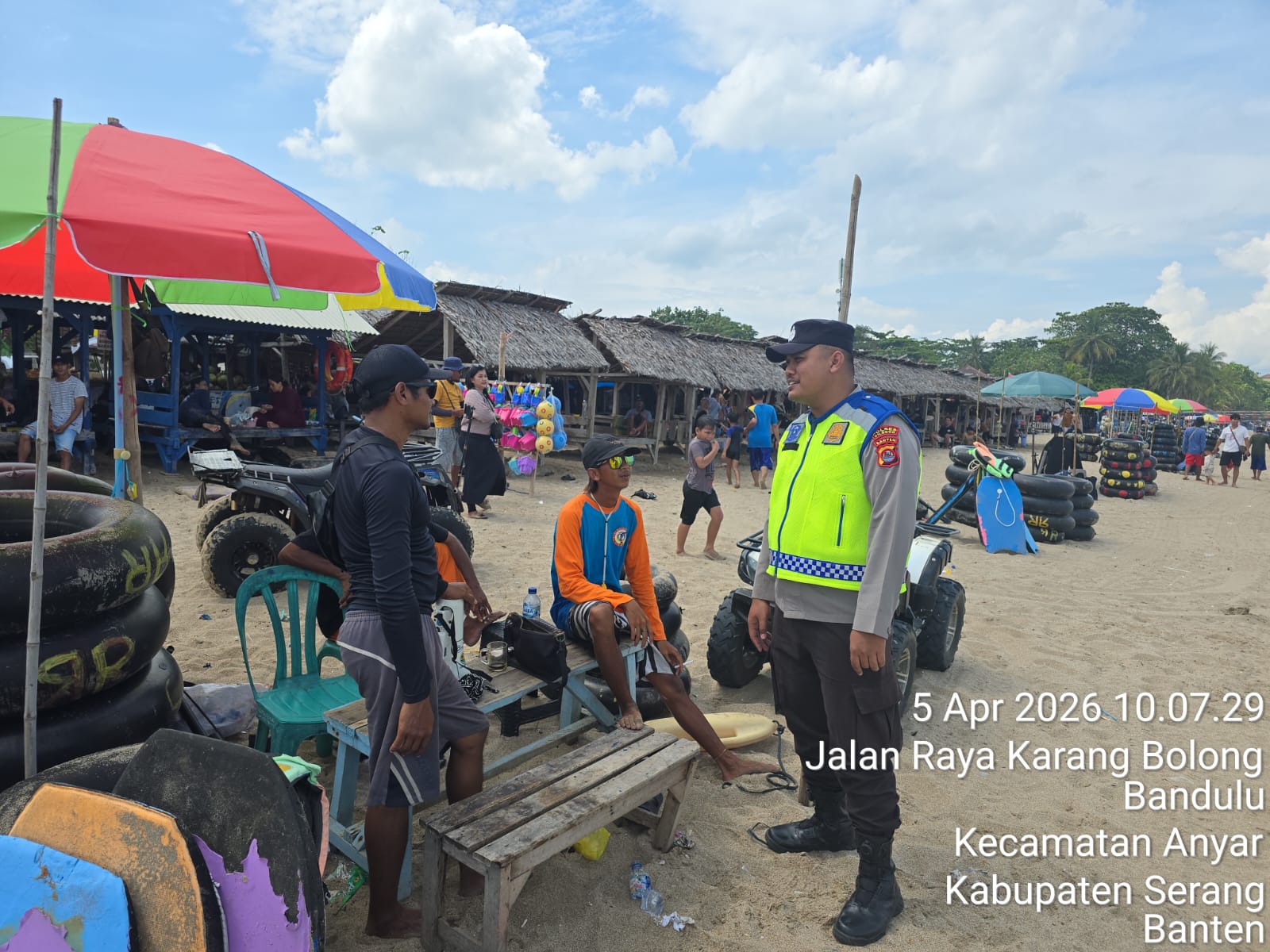Cilegon – Polres Cilegon Polda Banten, Personel Polsek Anyer Polres Cilegon melaksanakan sambang dan patroli kawasan wisata Pantai dan hotel dalam rangka menjaga Harkamtibmas di Kawasan Wisata Darkum Polsek Anyer Polres Cilegon pada saat weekend, Minggu (05/04/2026).