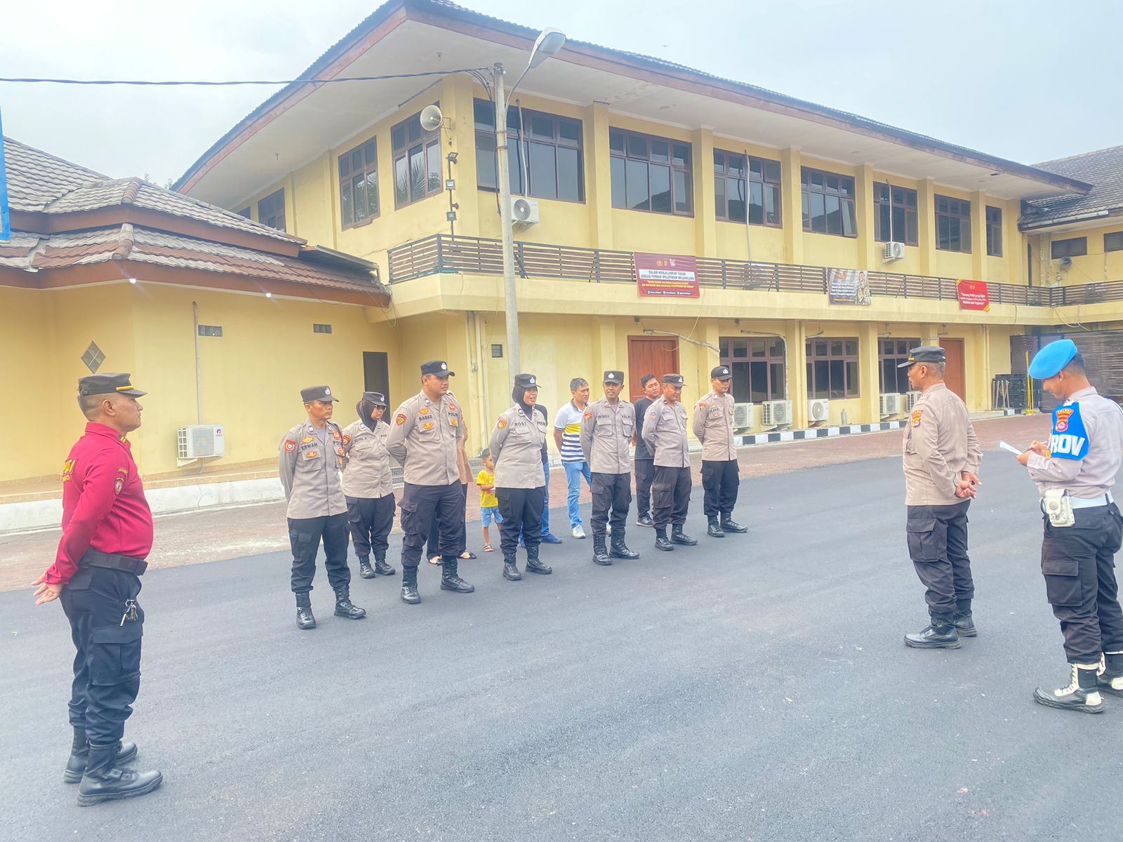 Cilegon,Polres Cilegon Polda Banten Pada Minggu/12/04/2025 Pukul 08.00 Wib,Aipda Emi Prasetyo selaku personil siwas Polres Cilegon Pengechekan kehdiran anggota yang sedang  melaksanakan kegiatan apel peleton kerangka  di lapangan apel Polres Cilegon.
